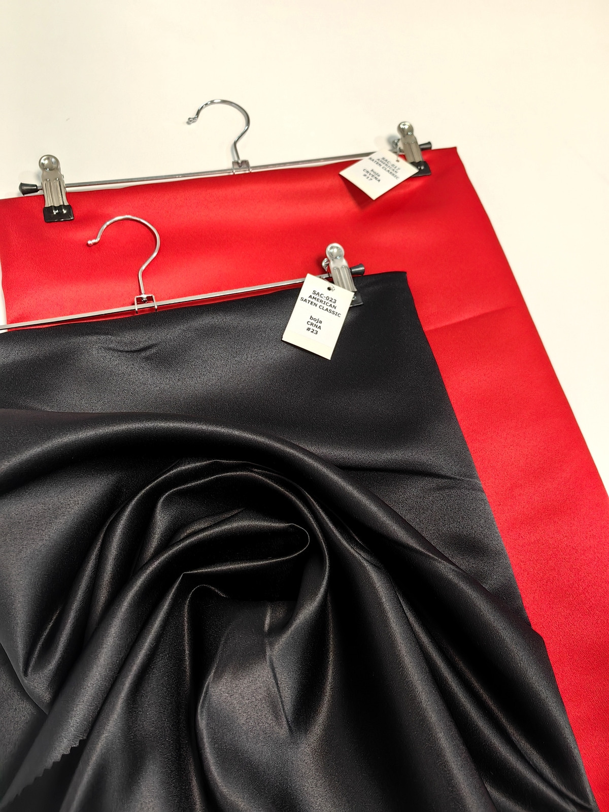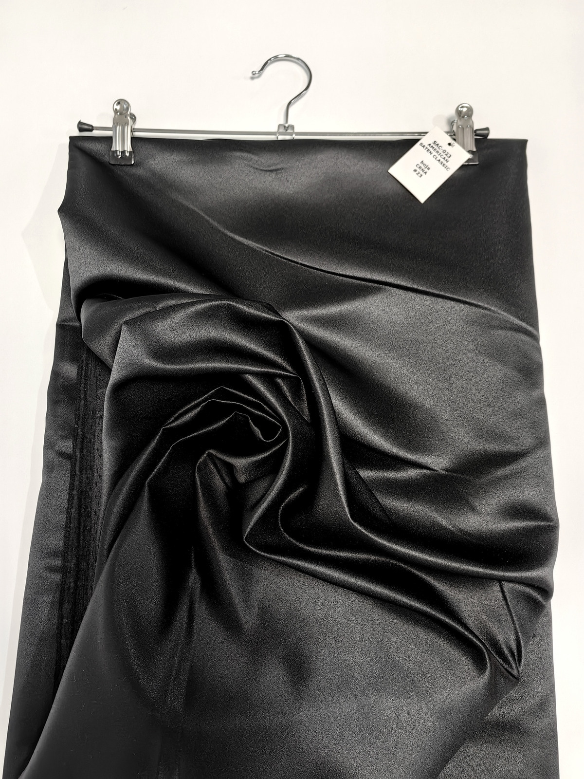 Američki saten klasični boja Crna ili Mat saten savršeno drži oblik, ima mat površinu, koju karakteriše visoka otpornost na habanje. Ovaj saten je gust, stabilan u obliku, ne sadrži likru, zbog čega se ne rasteže. Ne prosijava se. Nije skup. Koristi se u šivenju proizvoda koji zahtevaju zadržavanje oblika.