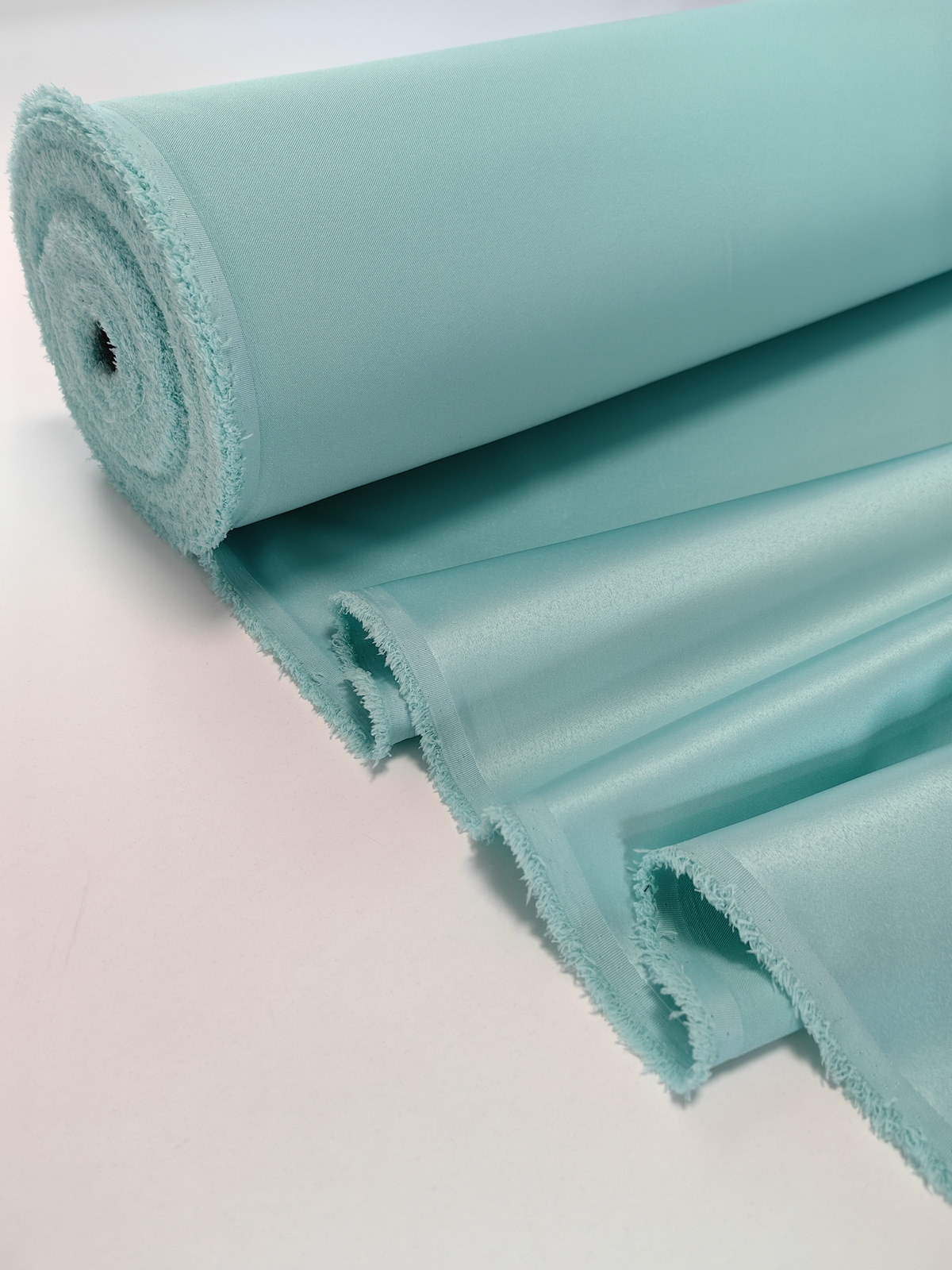 Američki saten likra boja Mentola lepo pada, lepo drapira, ima mat površinu, nije gust. Ovaj saten ima u sastavu i 97% polijestera 3% likre. Zbog toga dobro se rasteže u jednom pravcu.