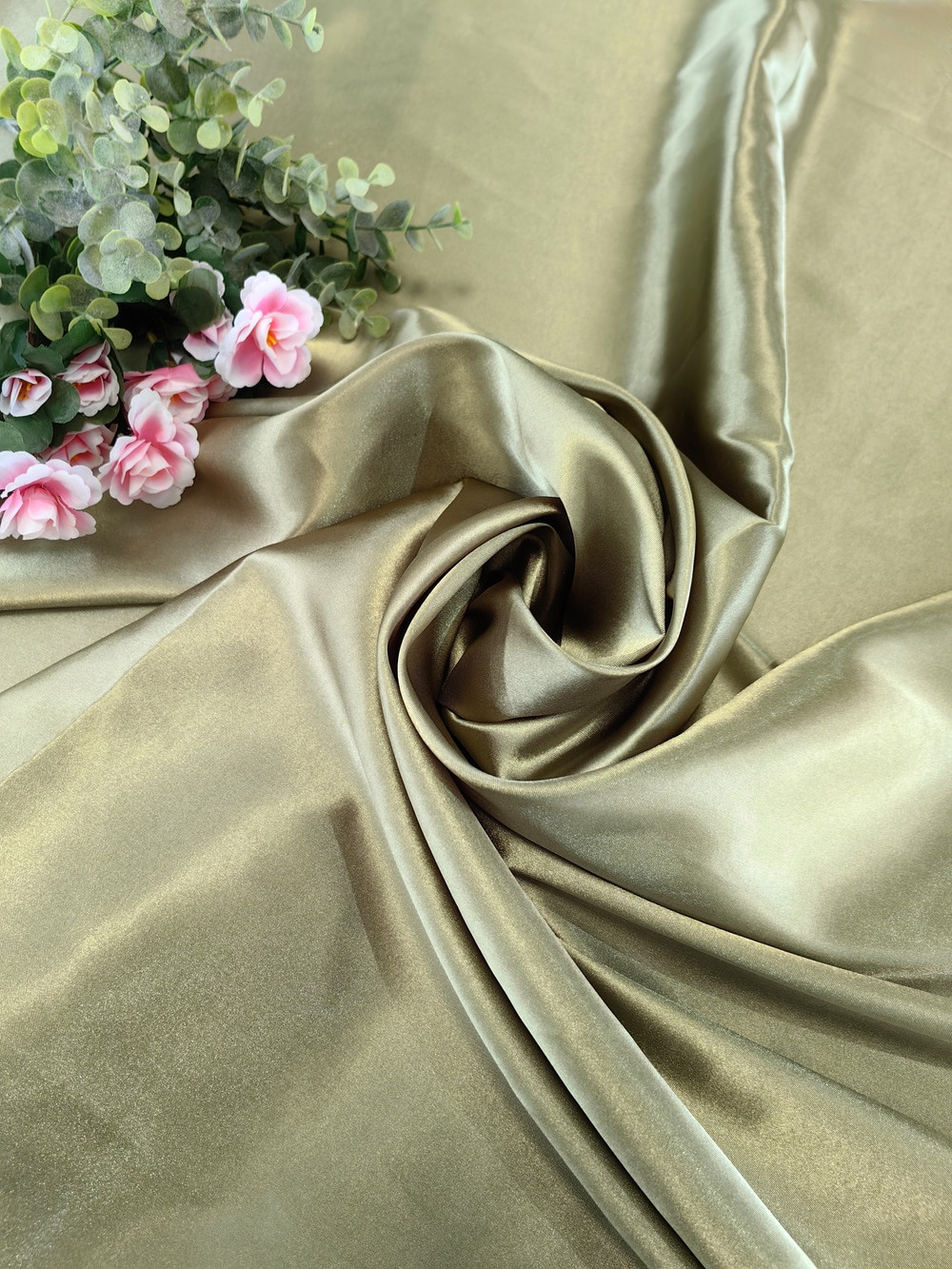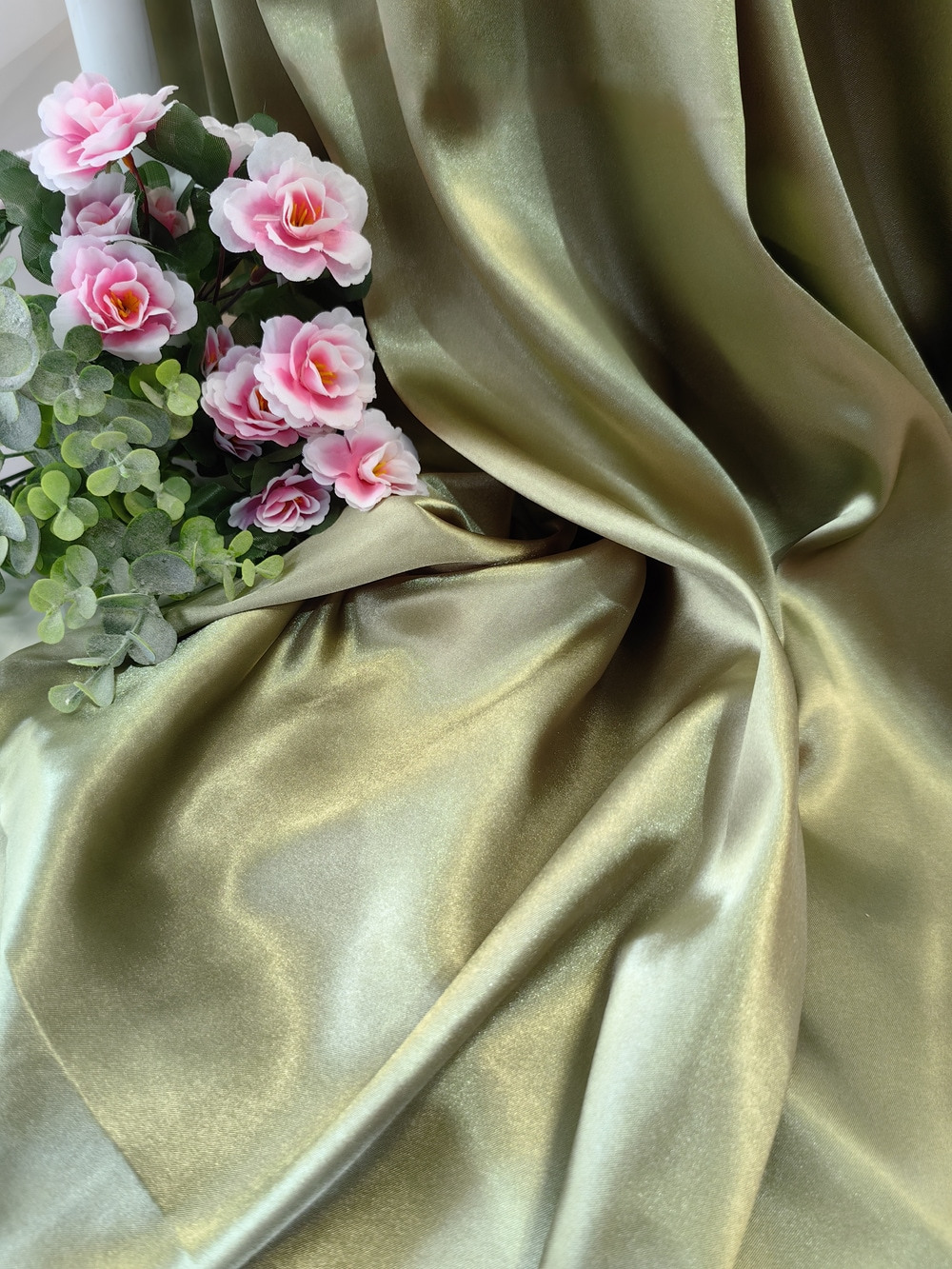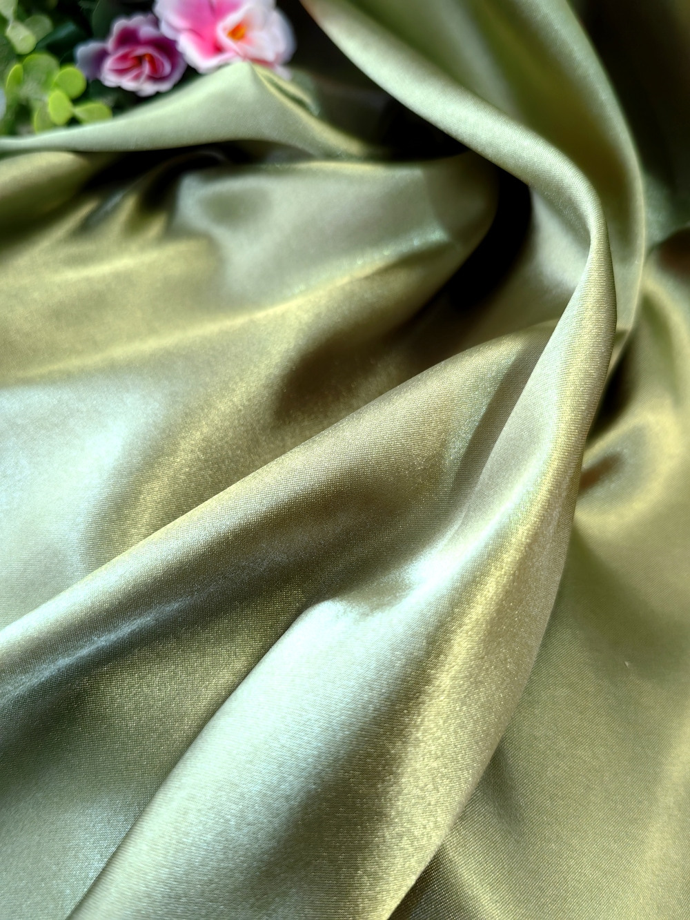 Saten Kristal boja Maslinasto Zelena je lagan, tanji saten sa lepim sjajem. Ali mat je sa druge strane. Nije providan. Ovaj saten je jeftin, ali dosta je kvalitetan. Ne ima likre u sastavu.