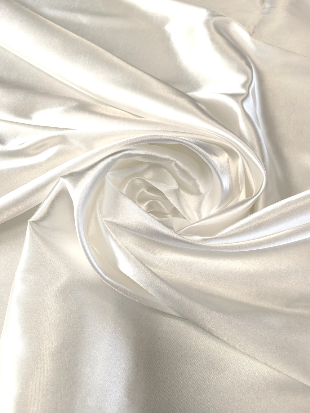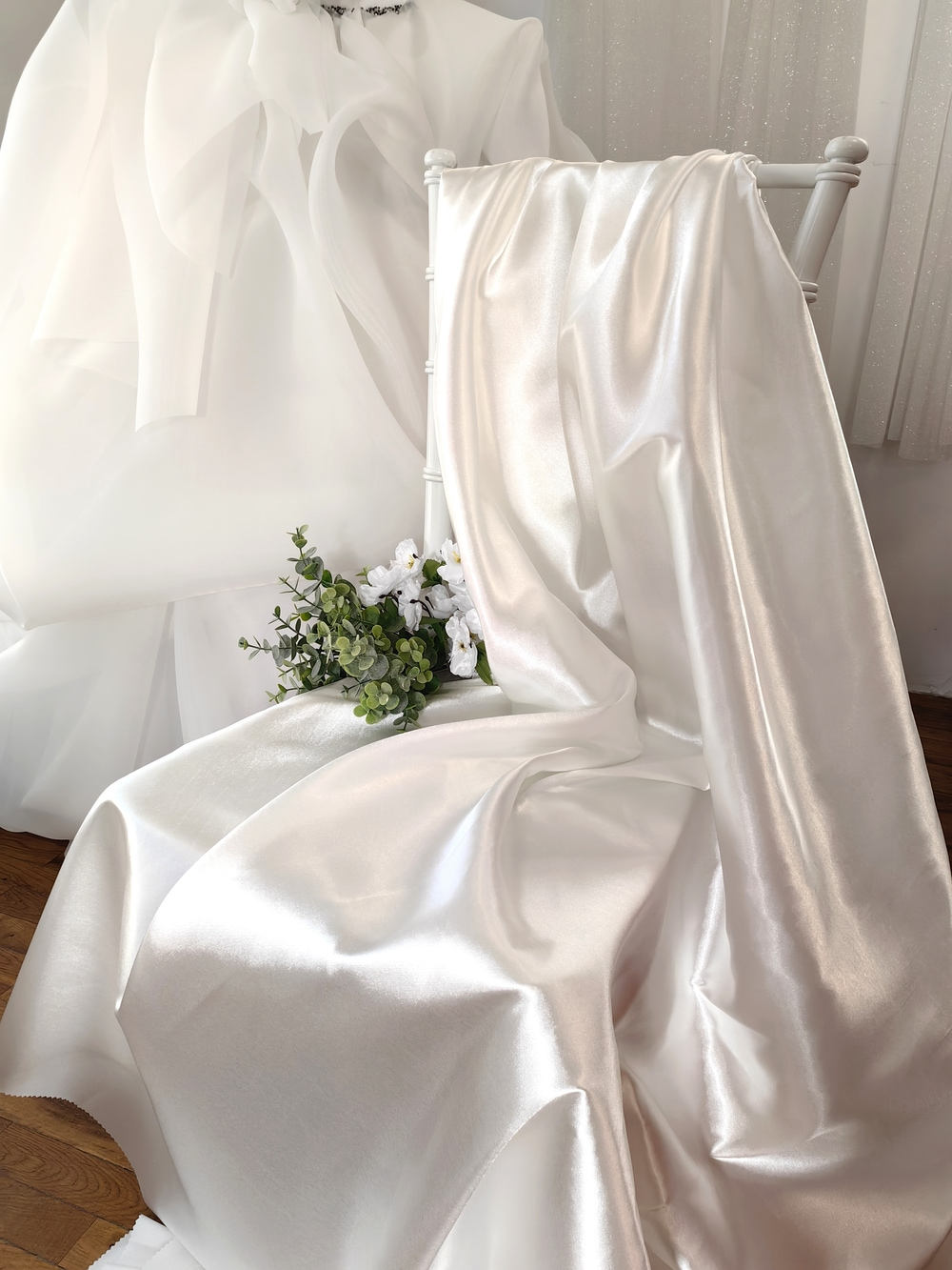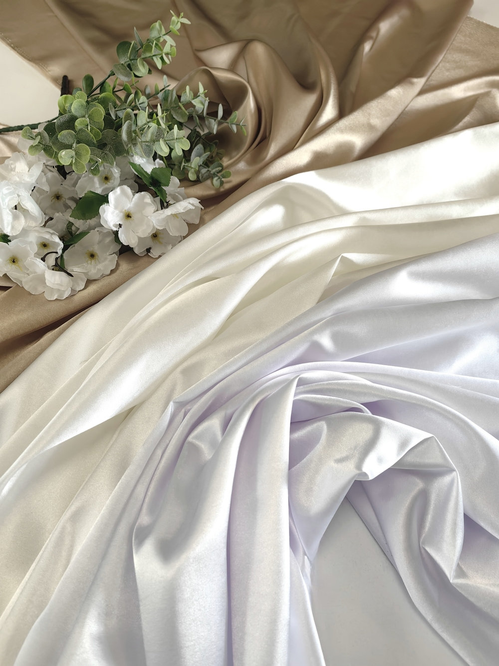 Saten Kristal boja Prva do Bele je jeftin, lagan, dobro drapira, tanji, sa lepim sjajem, ali sa druge strane je mat. Nije providan. Ovaj saten bez likre. Obično koriste za dekoraciju, za stolnjake, zavese, pozadine za slikanje, satenske mašne, ranere, salvete. Takođe možete da koristite kao postava za odeću.