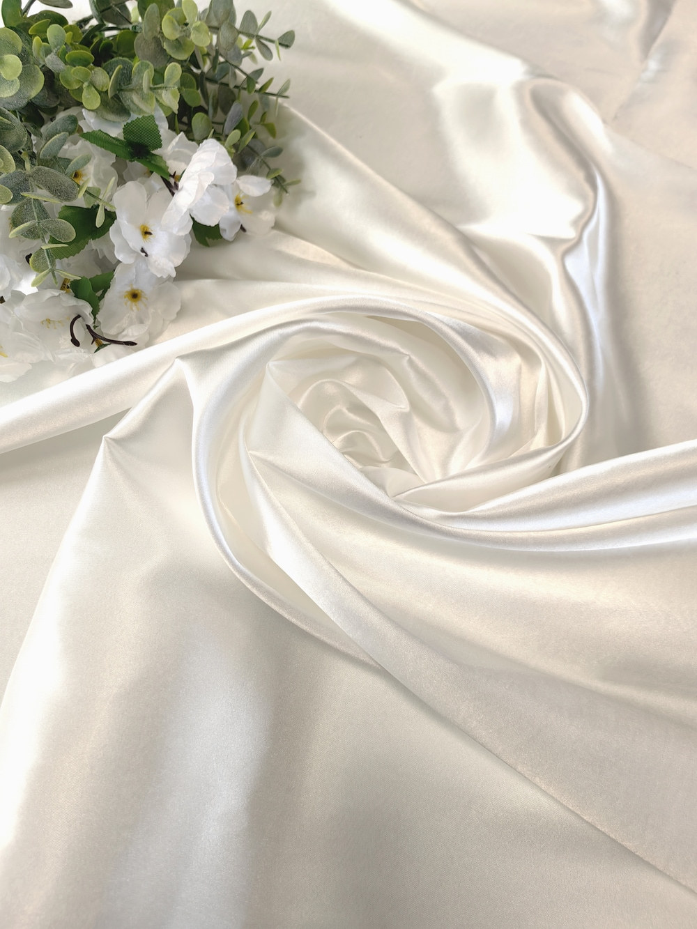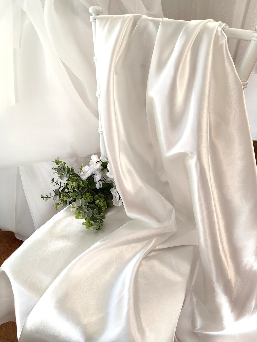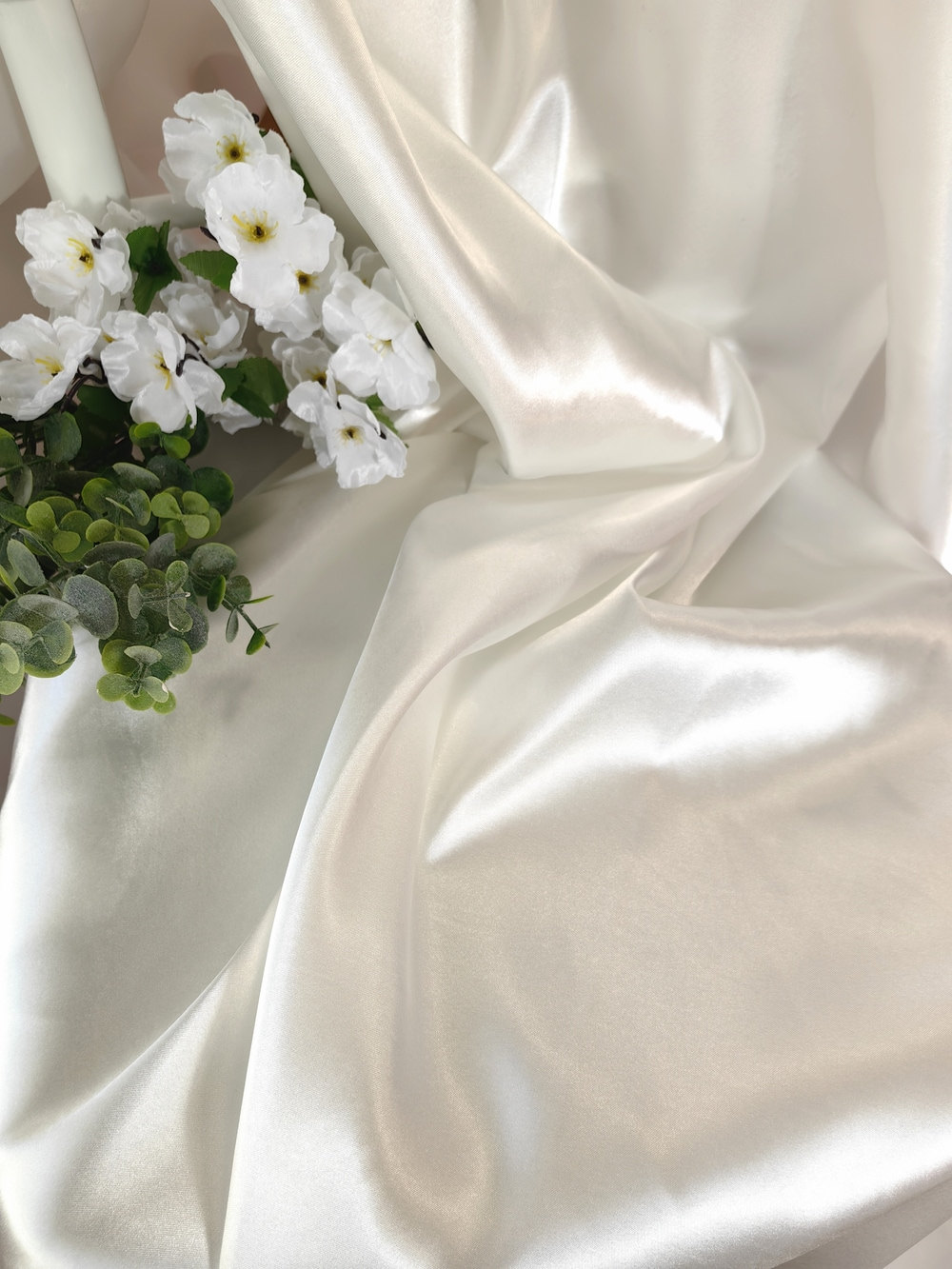 Saten Kristal boja Prva do Bele je jeftin, lagan, dobro drapira, tanji, sa lepim sjajem, ali sa druge strane je mat. Nije providan. Ovaj saten bez likre. Obično koriste za dekoraciju, za stolnjake, zavese, pozadine za slikanje, satenske mašne, ranere, salvete. Takođe možete da koristite kao postava za odeću.