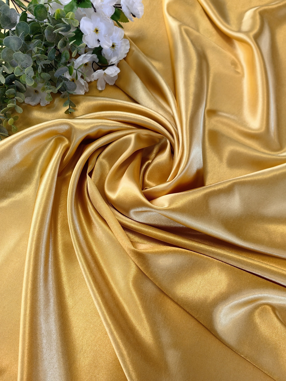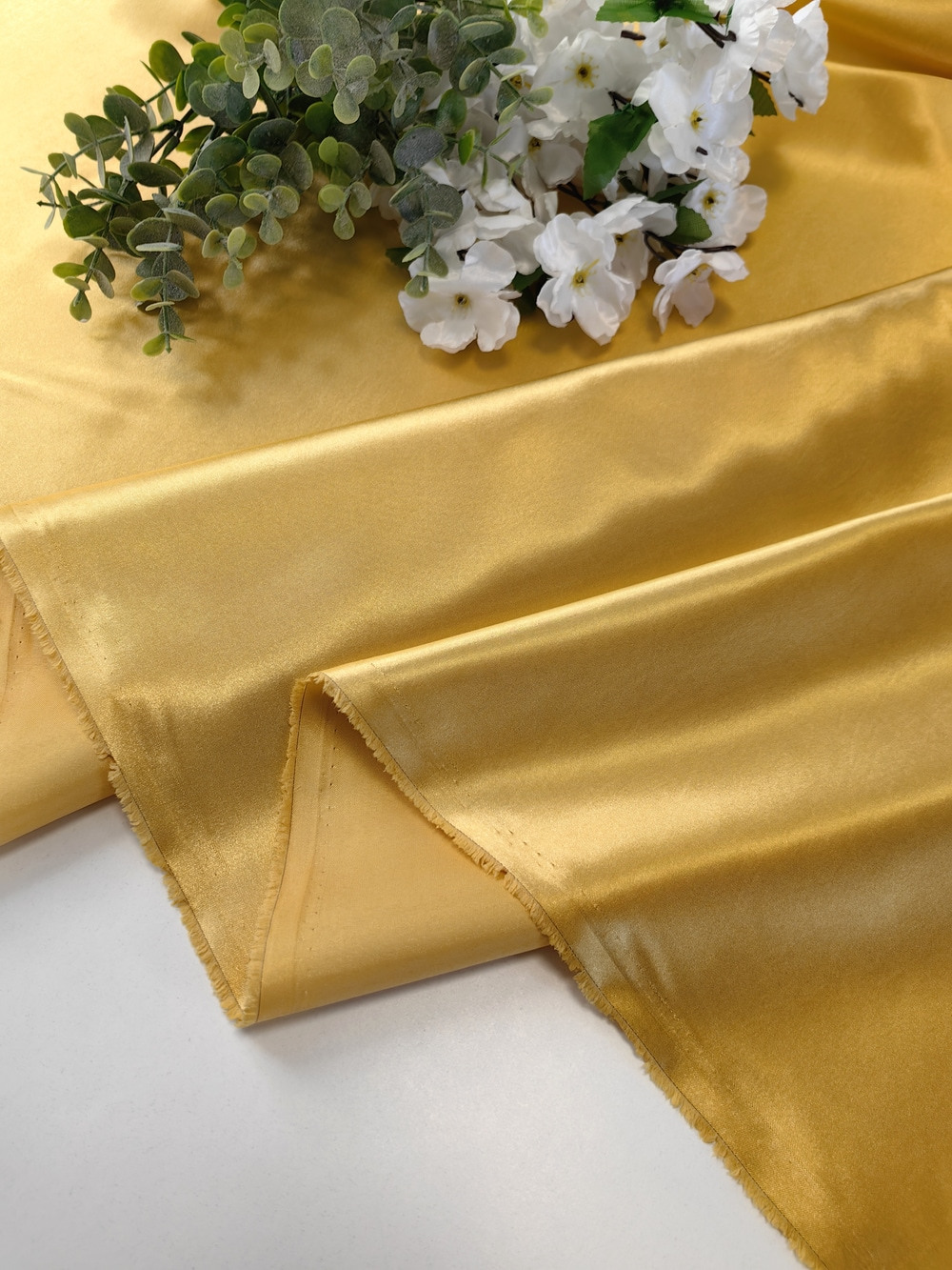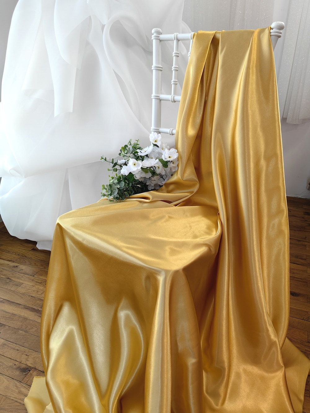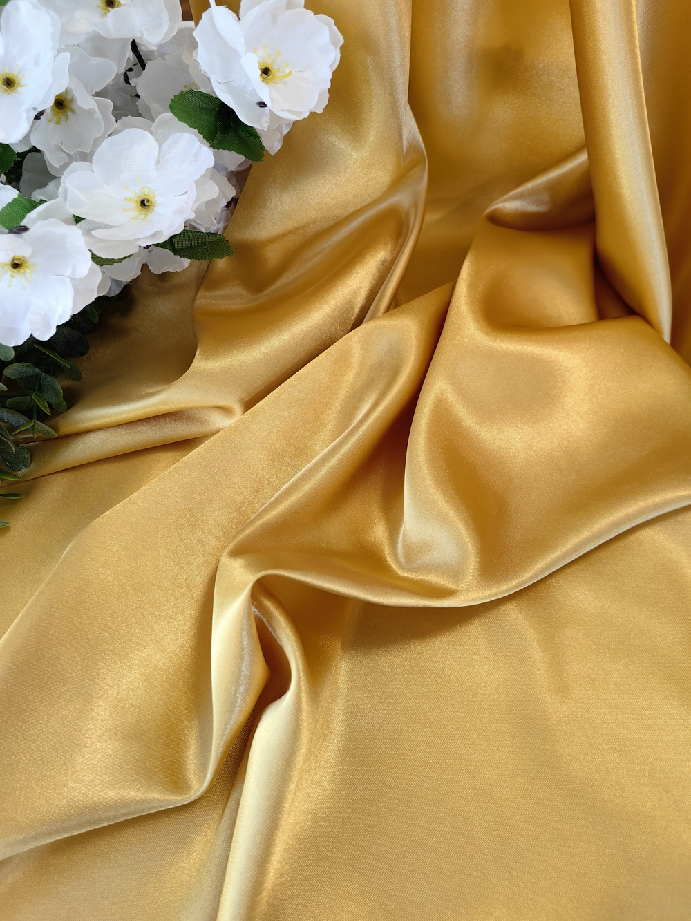 Saten Kristal boja Zlatna je jeftin, lagan, dobro drapira, tanji, sa lepim sjajem, ali sa druge strane je mat. Nije providan. Ovaj saten bez likre. Obično koriste za dekoraciju, za stolnjake, zavese, pozadine za slikanje, satenske mašne, ranere, salvete. Takođe možete da koristite kao postava za odeću.