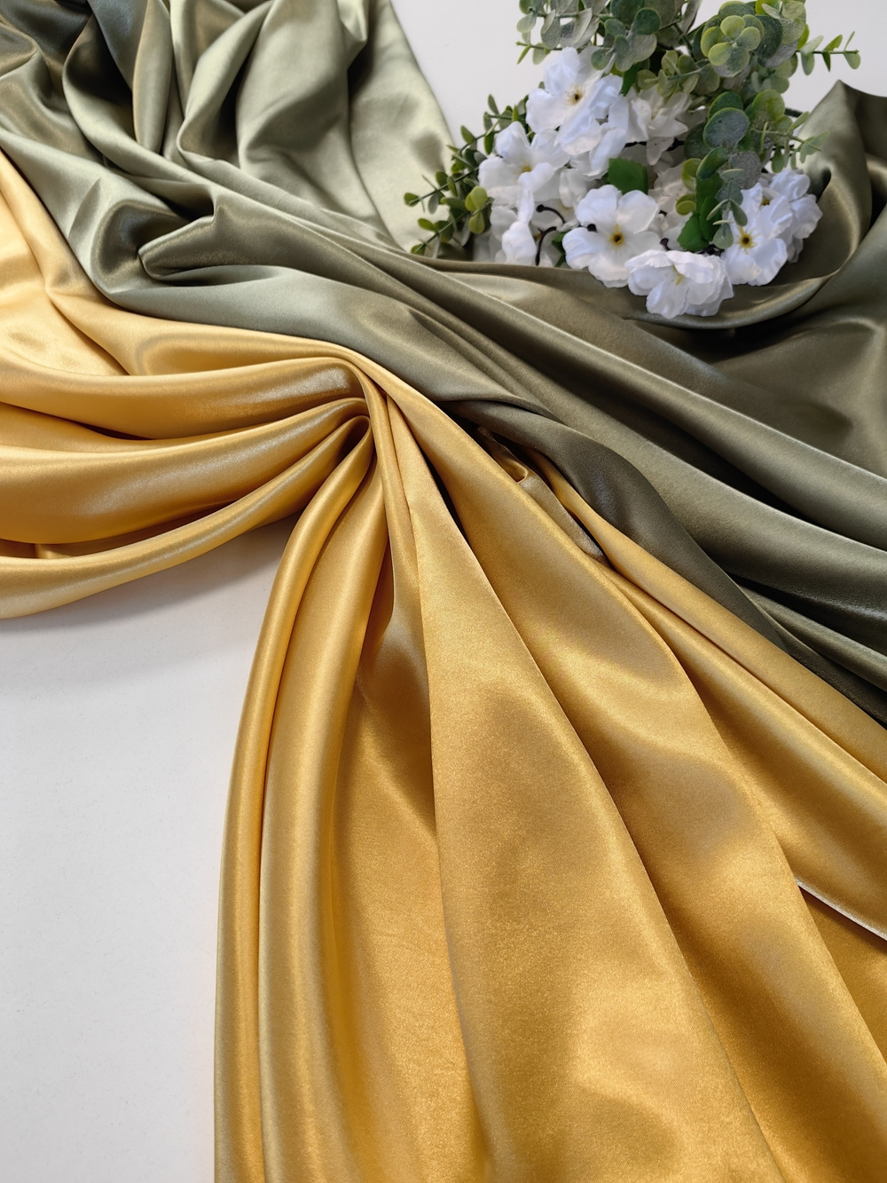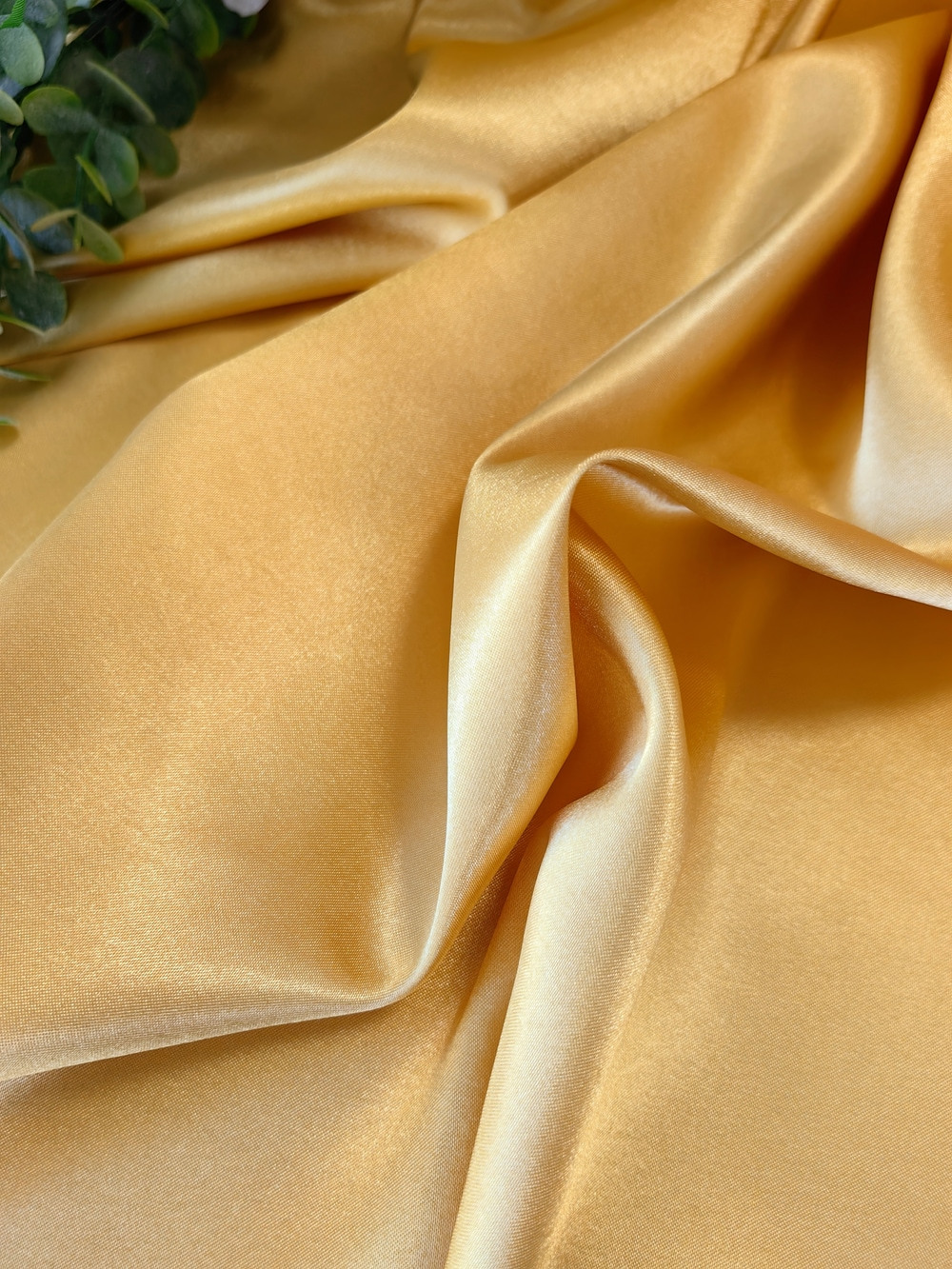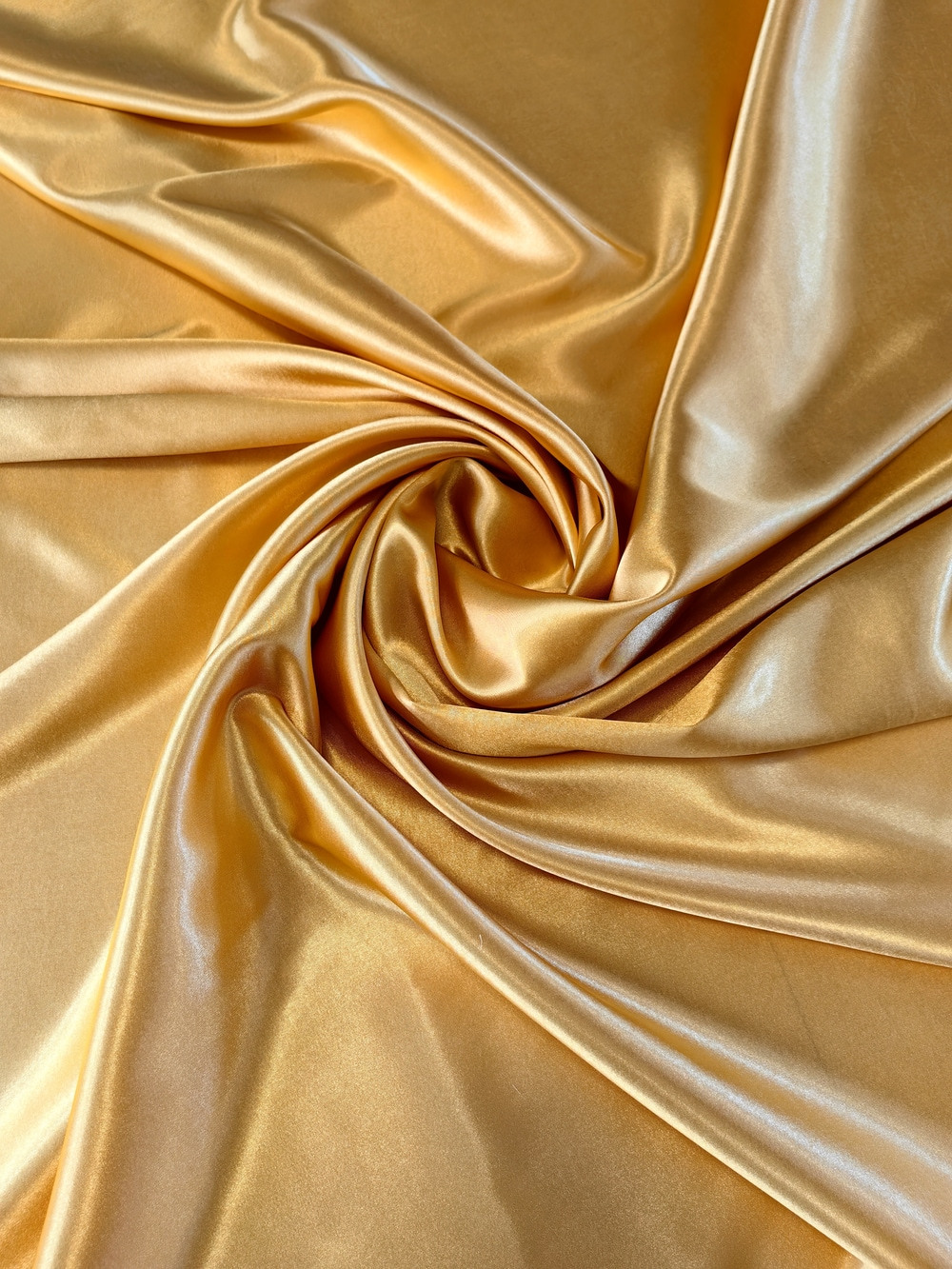 Saten Kristal boja Zlatna je lagan, tanji saten sa lepim sjajem. Ali mat je sa druge strane. Nije providan. Ovaj saten je jeftin, ali dosta je kvalitetan. Ne ima likre u sastavu.