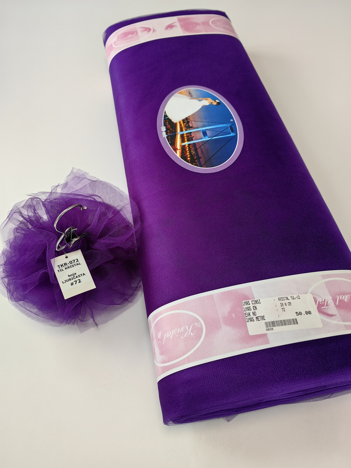 Til Kristal boja Ljubičasta upadljiv, privlačan, sa primetnim kristalnim sjajem. Savršeno drži oblik, nje skup. Najviše se koristi za dekor venčanja, proslava i automobila, za kostime, maskenbal, baletske pačke. Takođe se koristi za donje suknje ispod teških tkanina.