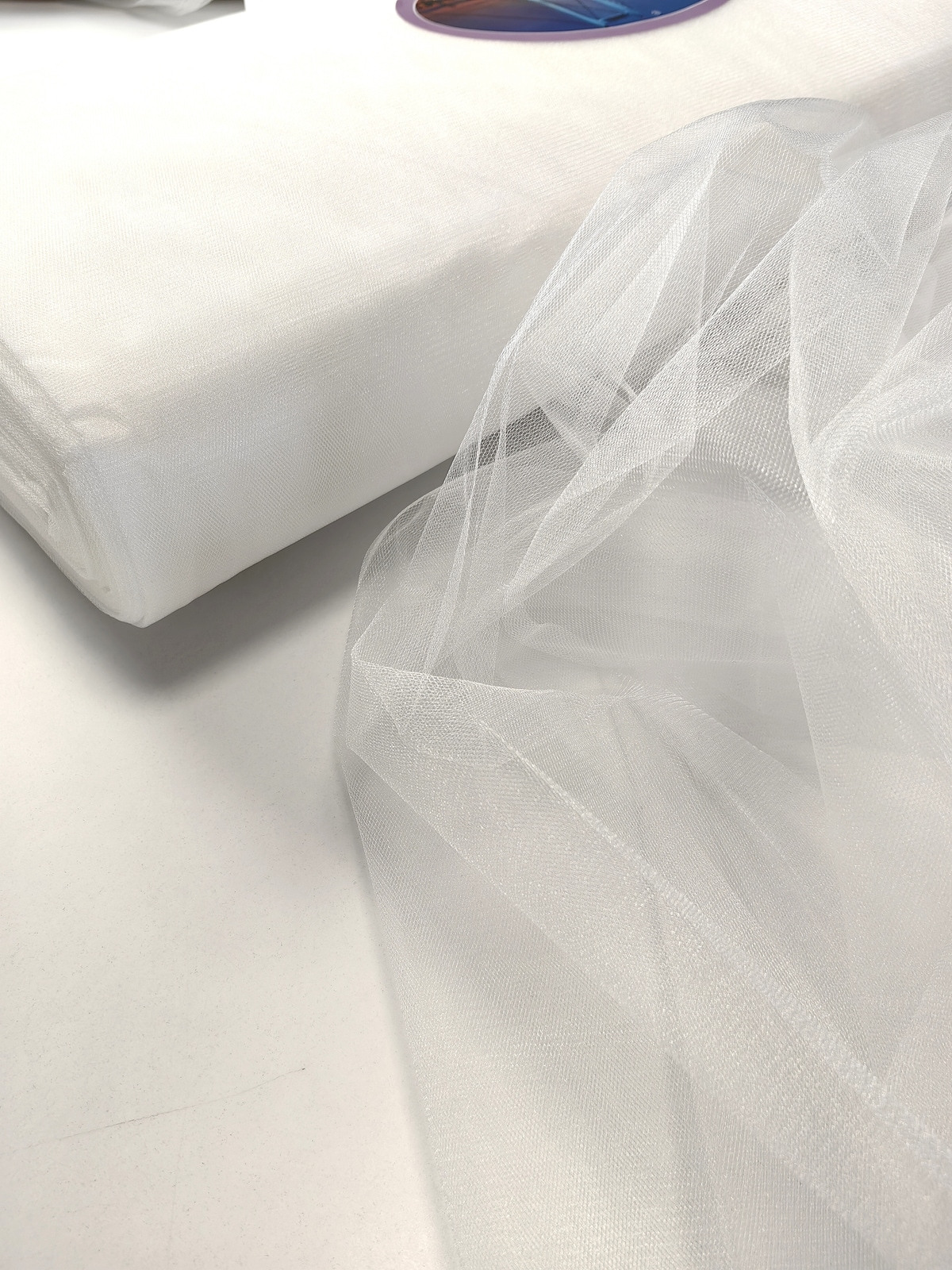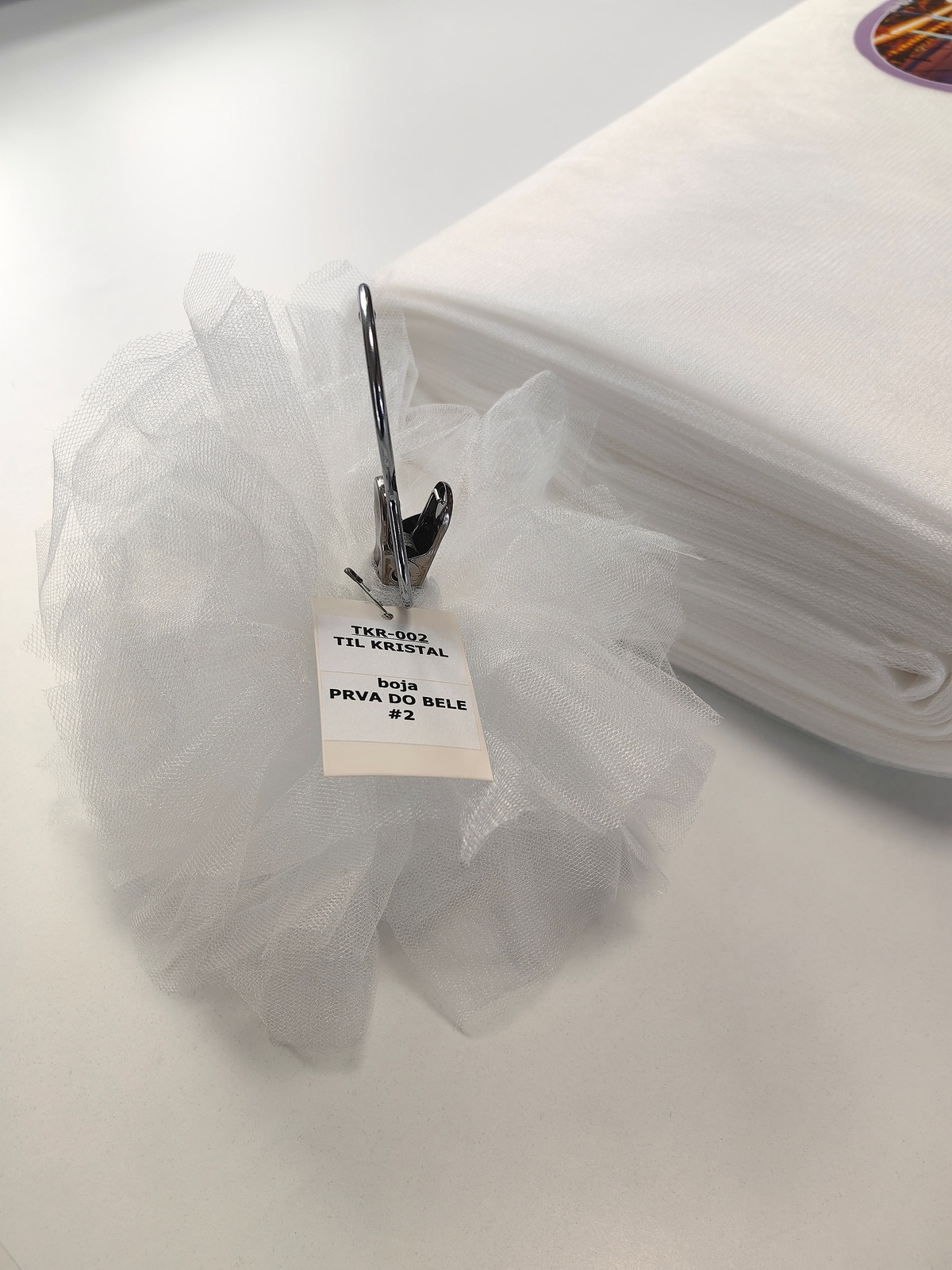 Til Kristal boja Prva do Bele upadljiv, privlačan, sa primetnim kristalnim sjajem. Savršeno drži oblik, nje skup. Najviše se koristi za dekor venčanja, proslava i automobila, za kostime, maskenbal, baletske pačke. Takođe se koristi za donje suknje ispod teških tkanina.