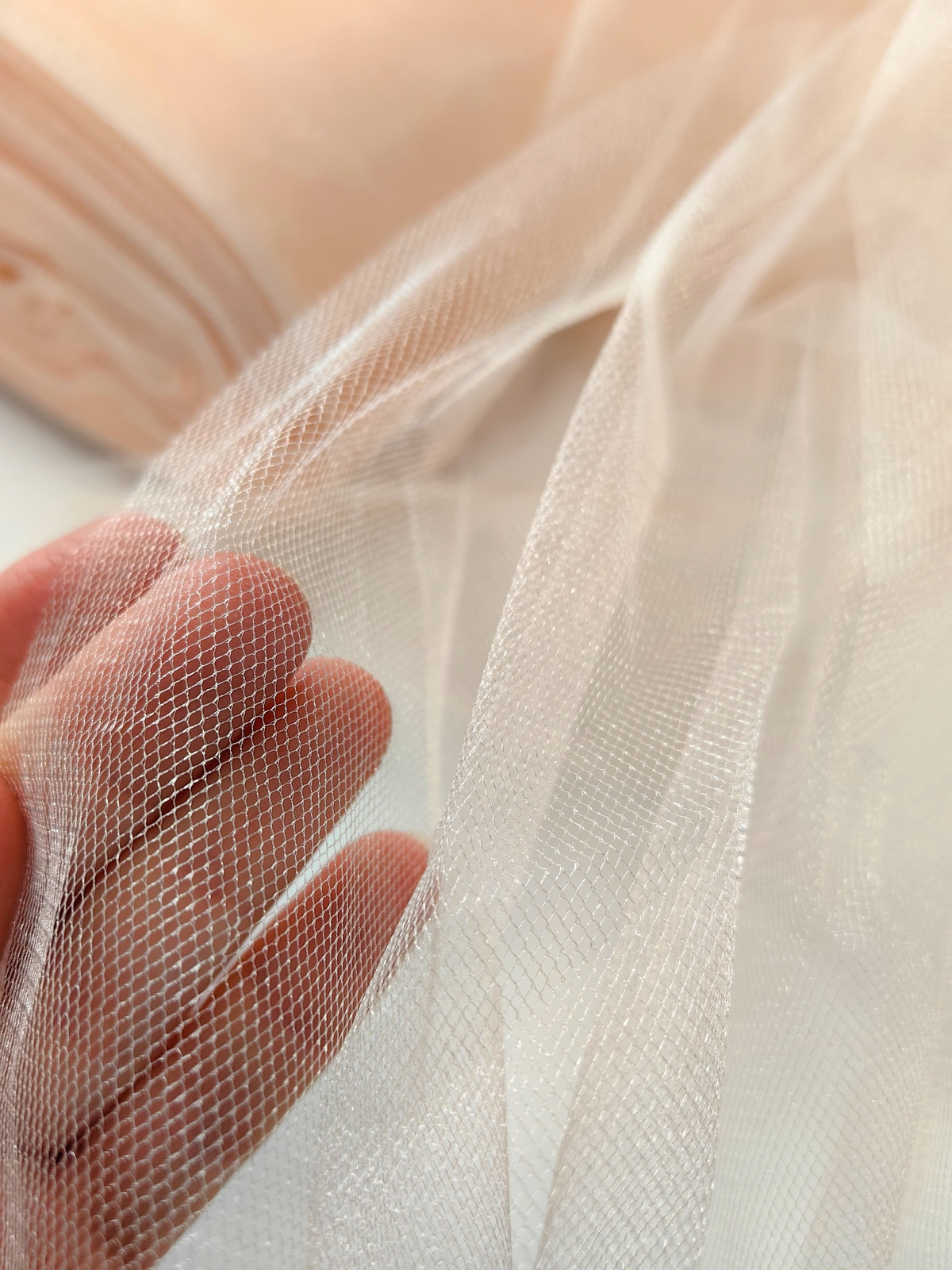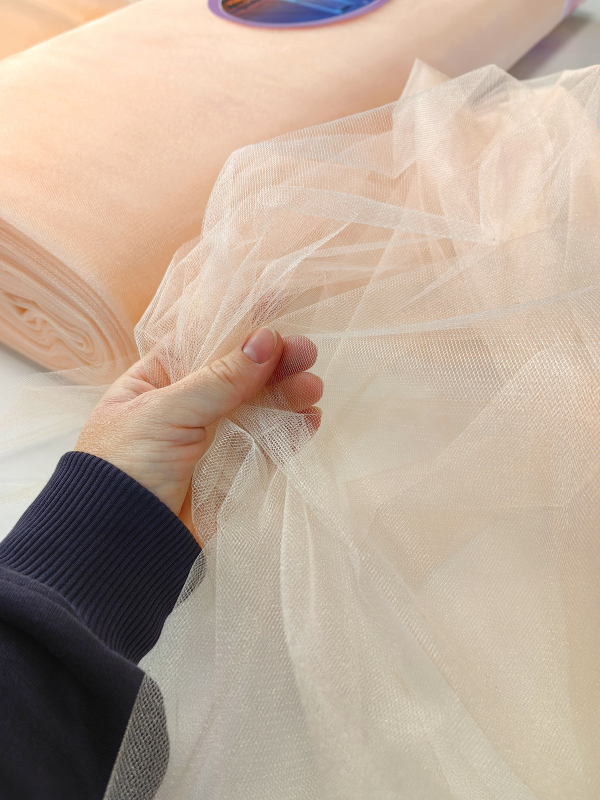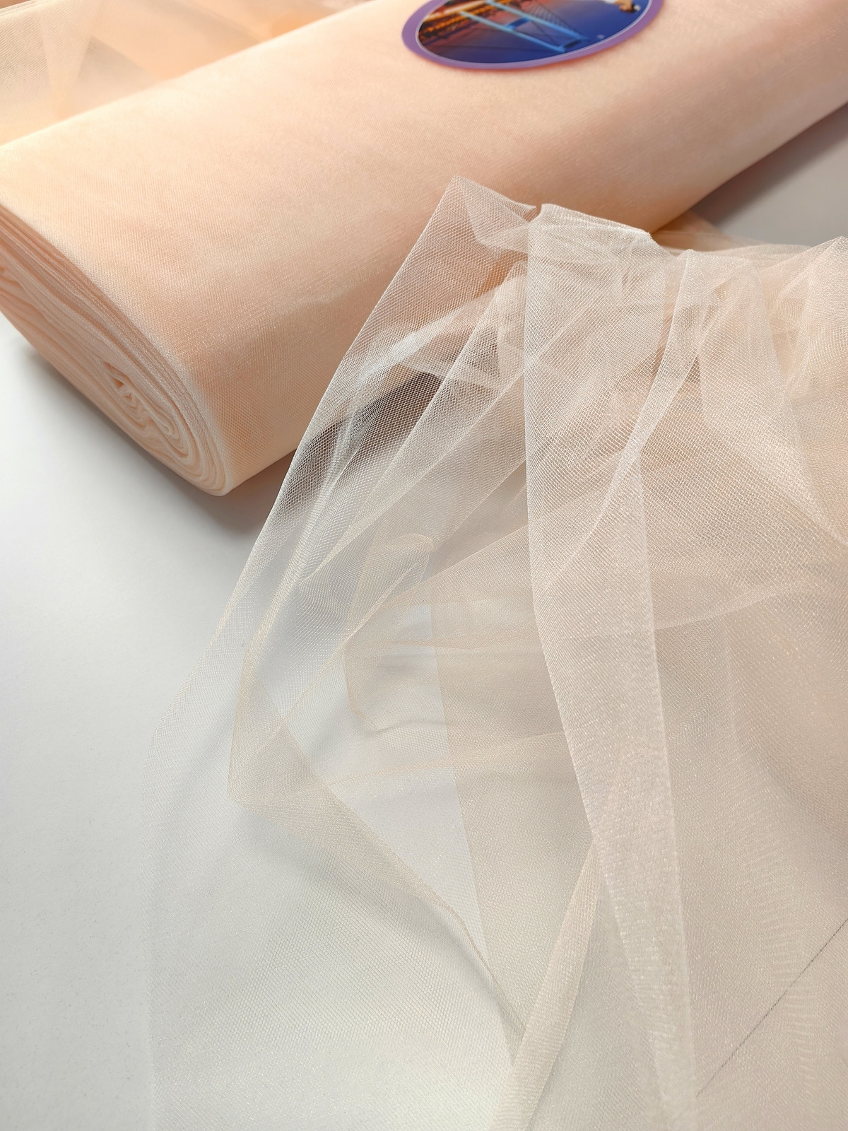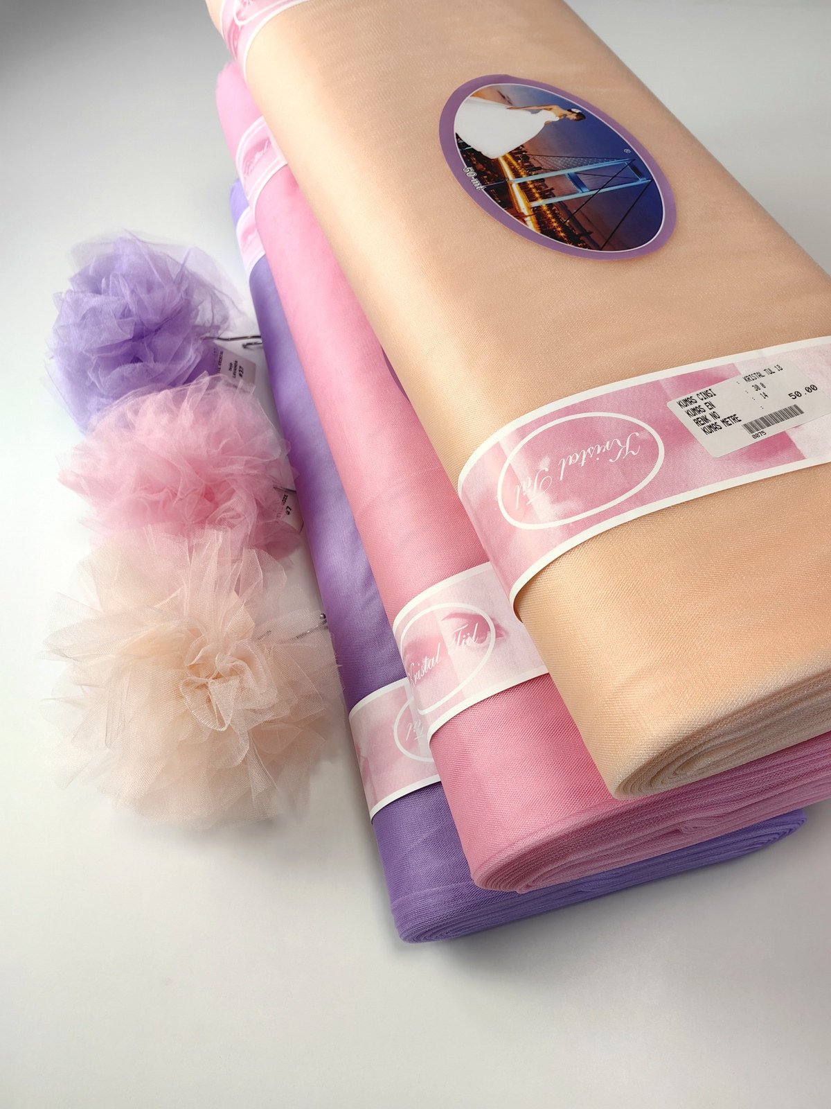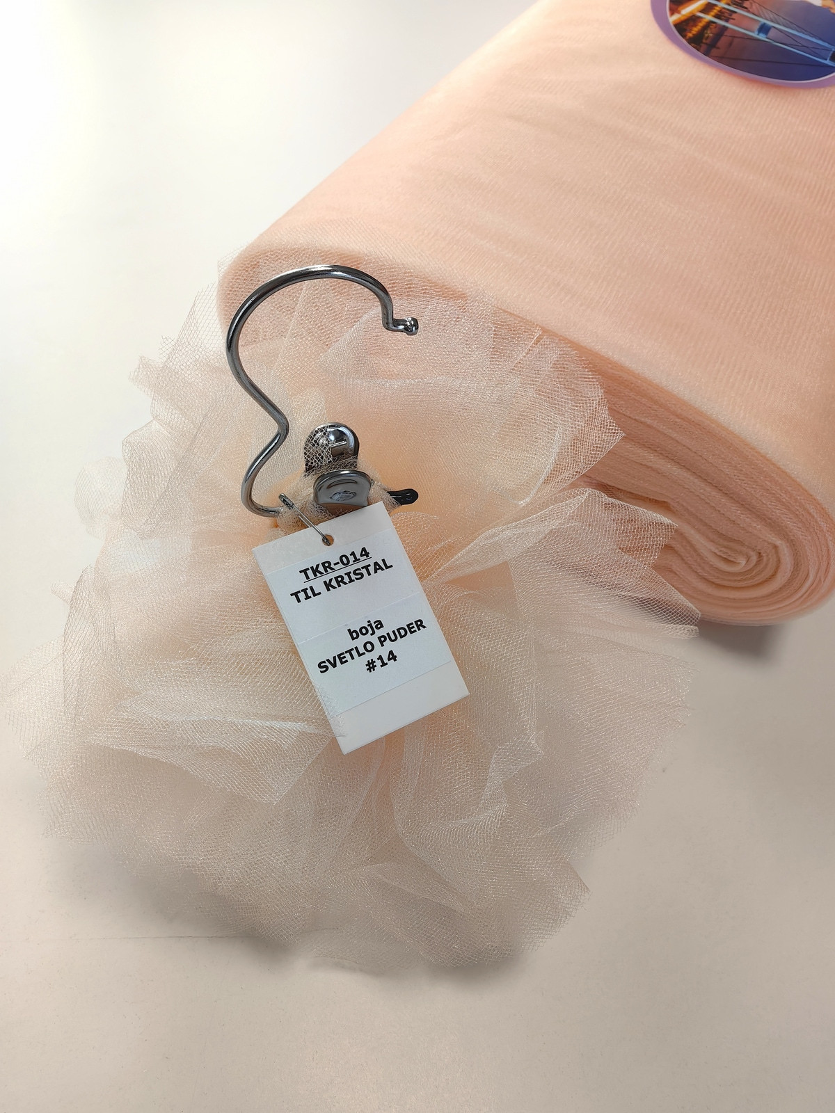 Til Kristal boja Svetlo Puder upadljiv, privlačan, sa primetnim kristalnim sjajem. Savršeno drži oblik, nje skup. Najviše se koristi za dekor venčanja, proslava i automobila, za kostime, maskenbal, baletske pačke. Takođe se koristi za donje suknje ispod teških tkanina.