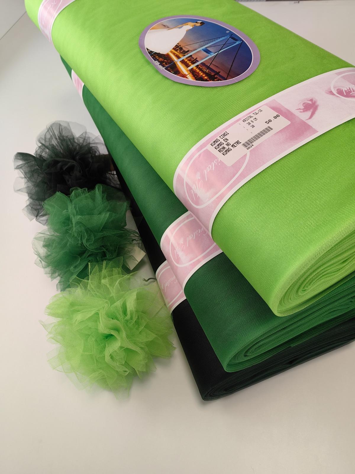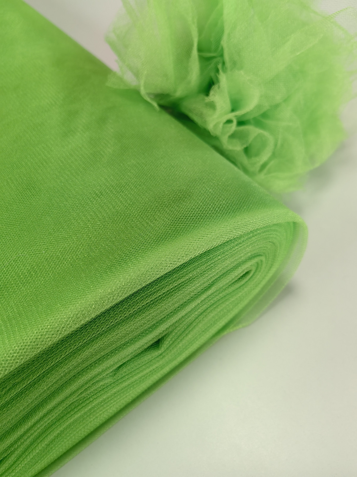 Til Kristal boja Zelena Jabuka upadljiv, privlačan, sa primetnim kristalnim sjajem. Savršeno drži oblik, nje skup. Najviše se koristi za dekor venčanja, proslava i automobila, za kostime, maskenbal, baletske pačke. Takođe se koristi za donje suknje ispod teških tkanina.