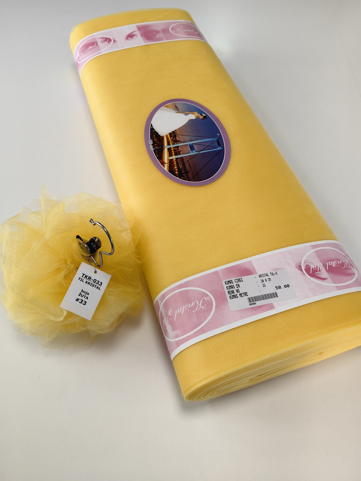 Til Kristal boja Žuta upadljiv, privlačan, sa primetnim kristalnim sjajem. Savršeno drži oblik, nje skup. Najviše se koristi za dekor venčanja, proslava i automobila, za kostime, maskenbal, baletske pačke. Takođe se koristi za donje suknje ispod teških tkanina.