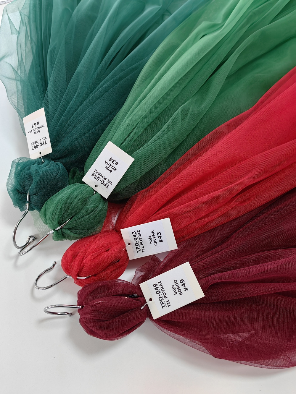 Til Poyraz boja Bordo je lagan, lepršav, providan, mat, nje skup. Na raspolaganju je široka paleta boja. Koristi se za dekor svadbe i proslava, kućni dekor, baldahine, haljine, suknje, kostime etc.